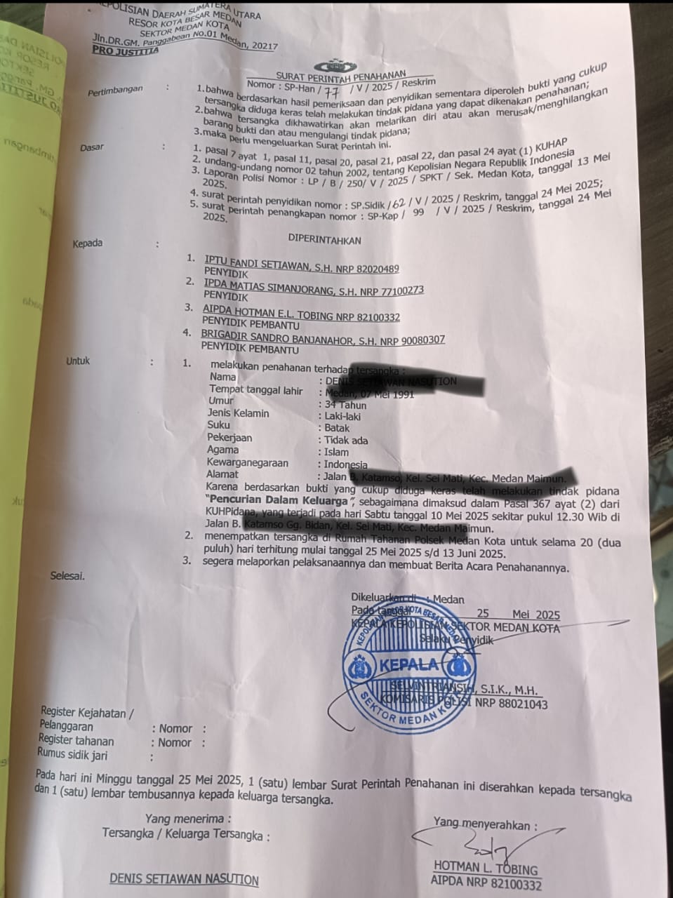 Kotakita.net, Medan| Polsek Medan Teladan, Porlertabes Medan menangkap dan menahan DSN (inisial, red), 34 tahun dengan persangkaan “Pencurian dalam Keluarga” sesuai dengan pasal 367 ayat (2) KUHPidana. Dugaan Manipulasi Mindik kental terlihat dari penerbitan SPDP yang lebih awal sehari sebelum terbitnya Sprin-Sidik. Sabtu (31/5/2025).